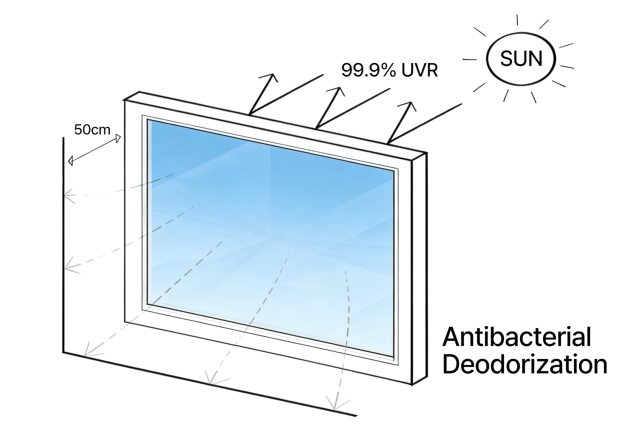 창면 최대 50cm 범위까지 항균·탈취 성능이 유효하며,24시간 내 유해균 99.9% 감소, 120분 이내 냄새 저감 효과 50%를